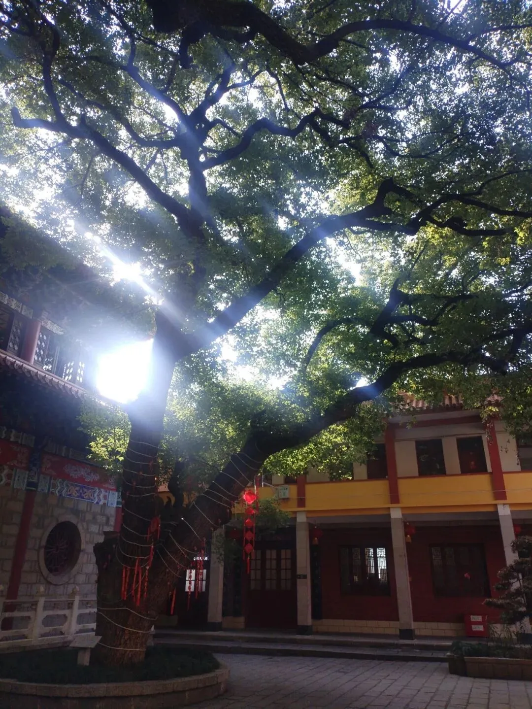 阳光透过枝叶照射下来,宛如佛光照耀。