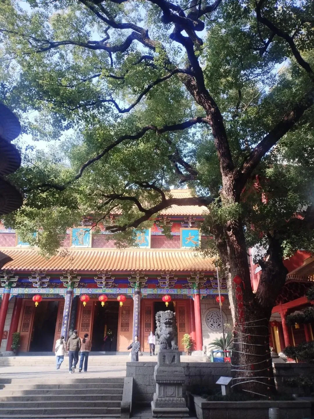 这三棵古樟树树冠宽大,枝叶茂盛,可谓是遮天蔽日。把大雄宝殿前这个不小的院子遮蔽得严严实实。