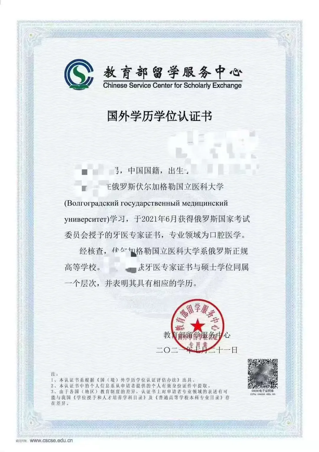 伏尔加格勒国立医科大学是中国(教育部)留学服务中心认证的俄罗斯高等教育院校,学生在伏尔加格勒国立医科大学学习,取得伏尔加格勒国立医科大学学位,教育部留学服务中心对学生所获学位给予学历认证。
