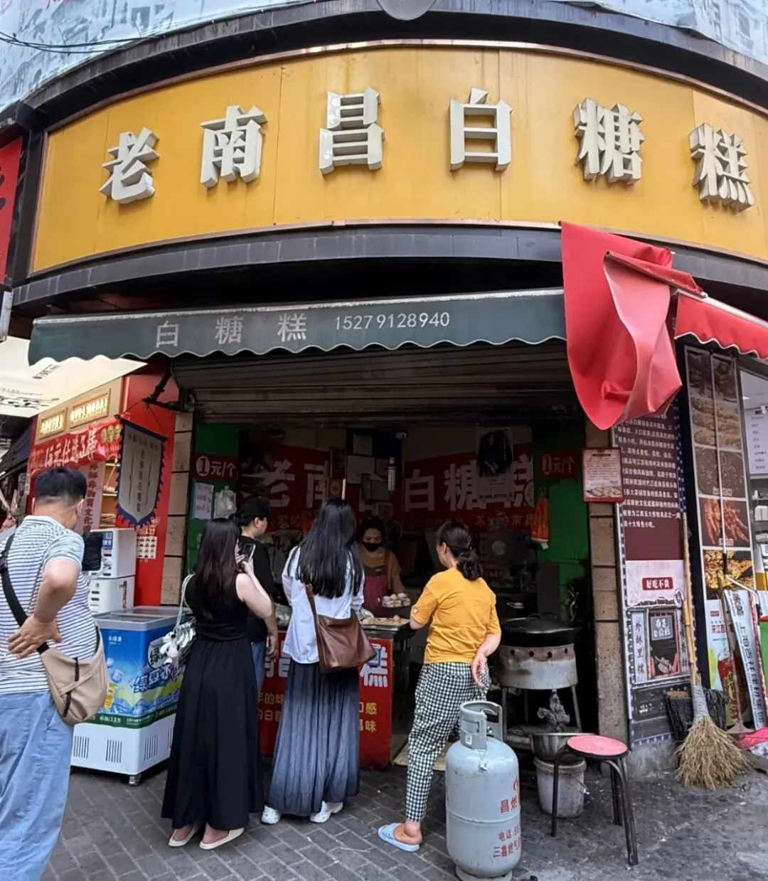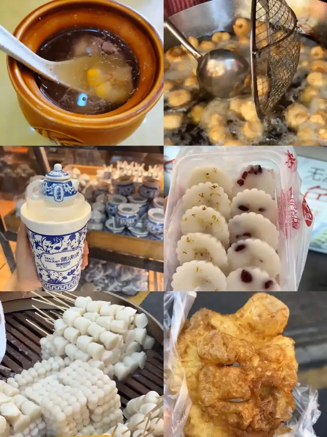 作为全球千余座万寿宫的祖庭,铁柱万寿宫已有1600余年历史,是赣鄱文化的精神地标,新建的围墙高大气派,宫内锁龙井与镇蛟铁柱,锈迹斑斑间藏着千年治水传说。如今的万寿宫历史文化街区,赣派老宅与文创小店相映,非遗作品与南昌小吃并立,让古韵里飘满市井烟火。逛累了坐下来,一份瓦罐汤,一根糖油条。几只老南昌甜糕加热罩子,一杯茶決決,一盘炒粉,享受午后时间。