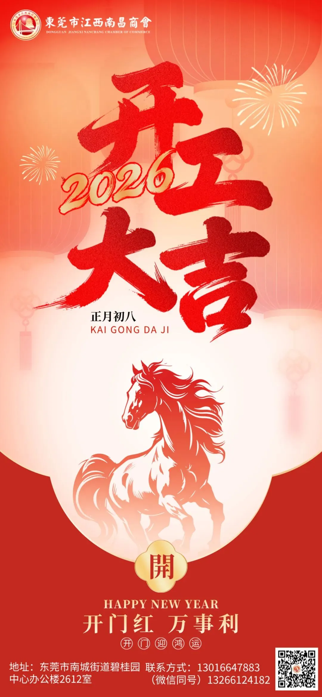 春启新程,万事兴龙;策马开工,聚力远航。值此癸卯开工吉时,东莞市江西南昌商会会长程争卿携全体会员,恭祝各位开工大吉,生意兴隆,龙马精神,大展宏图!