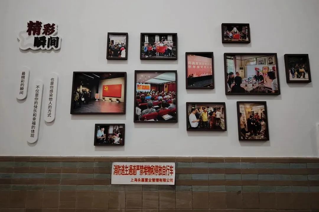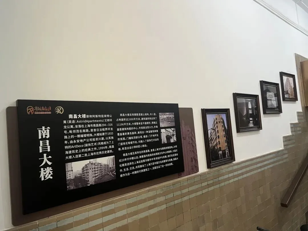 茂名南路151号——“岁月留心楼”,是南昌大楼的主楼,楼道墙面上展示着大楼历史的简介,居民们拍摄的老照片如时光碎片,拼凑出了一幅幅生动的历史画面。