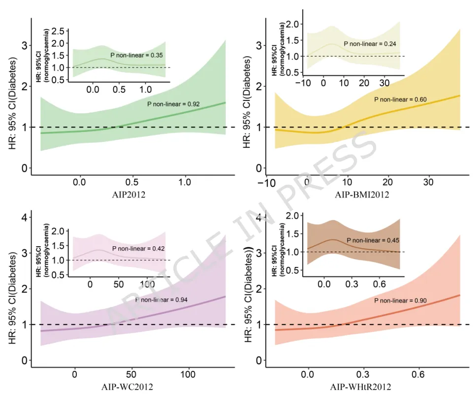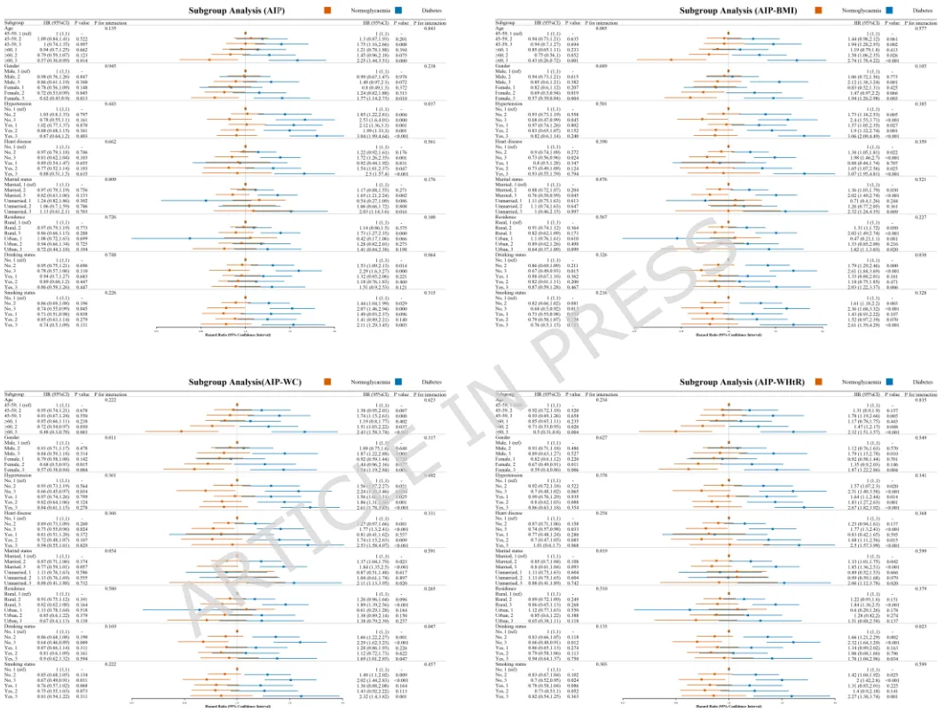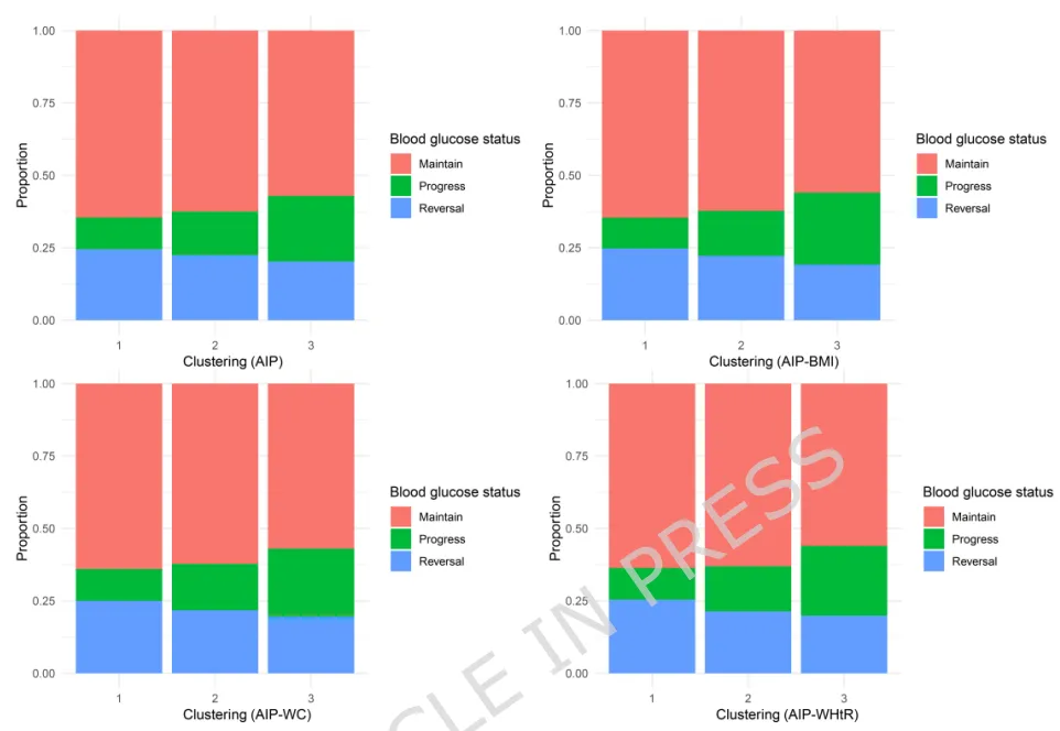 •技术方法:数据采集与清洗→AIP及AIP-肥胖复合指数→K-means聚类识别动态控制模式→多变量Cox回归量化各模式与血糖转归关联→WQS回归解析组分贡献权重→四向分解检验炎症介导效应→亚组分析、敏感性分析及外部数据验证稳健性。