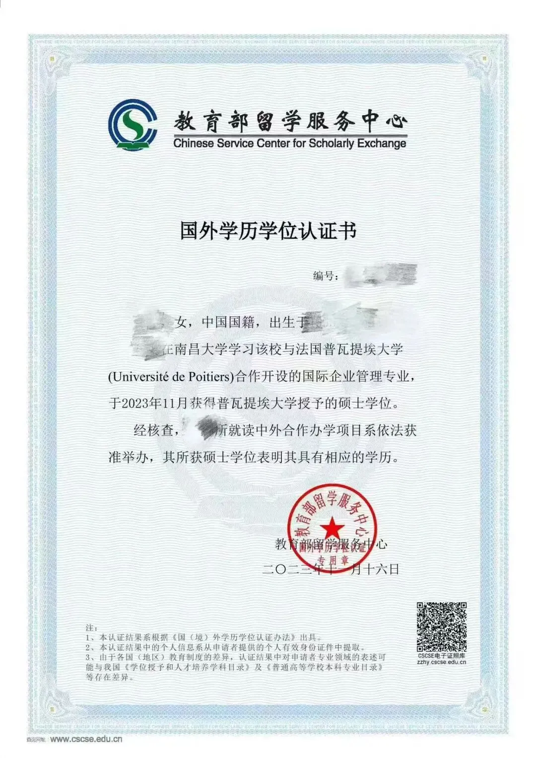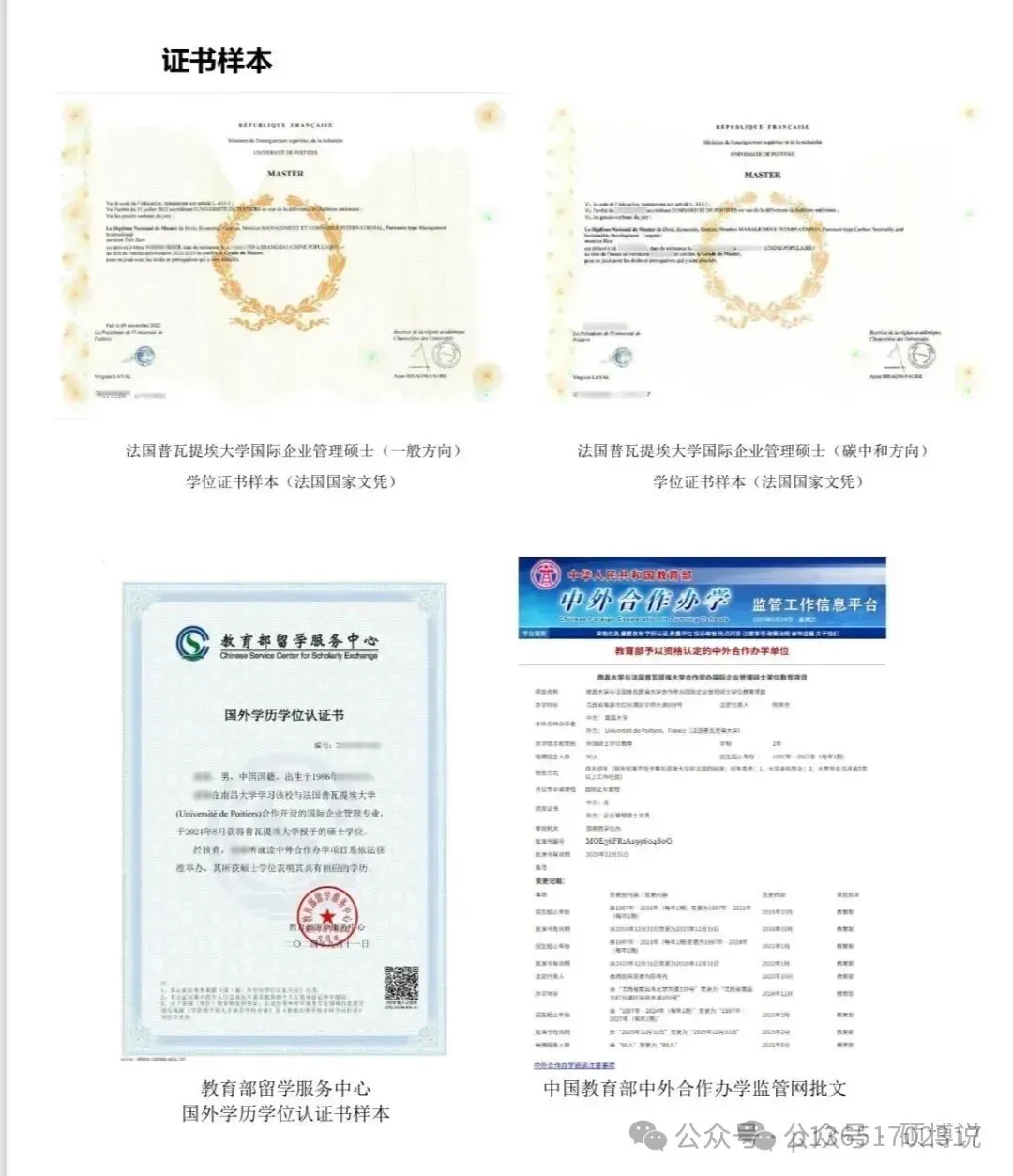 【证书】:法国普瓦提埃大学国际企业管理硕士证书+中国教育部留学服务中心学历学位认证书