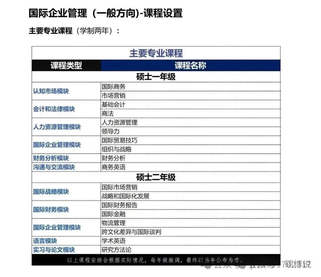 Q:中法国际企业管理硕士项目学制多长?有多少门课程?A:中法国际企业管理硕士项目学制两年,专业课每年分成几个模块,课程有国际商务、市场营销、财务会计、商法、人力资源管理、领导力、国际贸易技巧、组织学、财务分析、战略分析和国际化发展、国际市场营销、国际财务报告、国际金融、物流管理、文化差异与国际谈判、学术论文与研究方法等约18门课程(模块与专业课根据实际排课,每年会有微调,最终以当年公布的简章为准)。