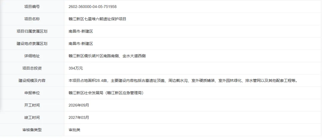 今天(2月24日),江西省项目投资平台公示了“赣江新区七星堆六朝遗址保护项目”的备案信息。394 万元的投资、2026 年 9 月开工的计划,让不少南昌人期待这处千年古墓群能早日成为新晋文旅打卡点。