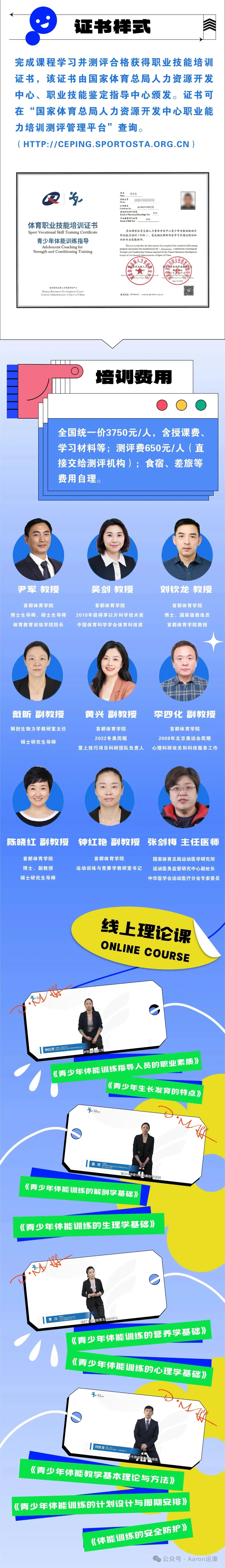 全国统一培训价格:3750元/人,测评价格:650元/人(食宿交通自理),费用包括线上及线下培训服务、学习材料等保障:由于每期名额有限,因学员个人原因退费,将扣除400元管理费及相关教材费用。培训开课后不予退费。这一课程体系已经经过前期试点阶段的全面打磨,课程研发专家针对学员及培训师反馈进行了系列微调优化升级,更加满足学员的各项实操技能提升需求。🎯 为什么要学青少年体能训练?