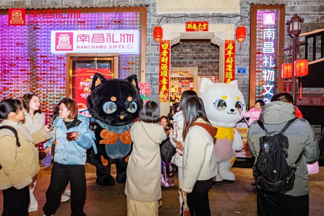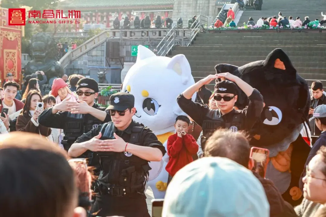 作为今年春节的重头戏,“黑猫白猫”人偶每日两场巡游,所到之处皆被游客团团围住、合影拍摄,更与滕王阁保安F4联动劲舞,为南昌增添了浓浓的烟火气与年味。同时,话题热度持续攀升,“黑猫白猫陪你过大年”话题在抖音、小红书等平台累计曝光量突破300万次,成为南昌春节文旅市场的一大亮点。