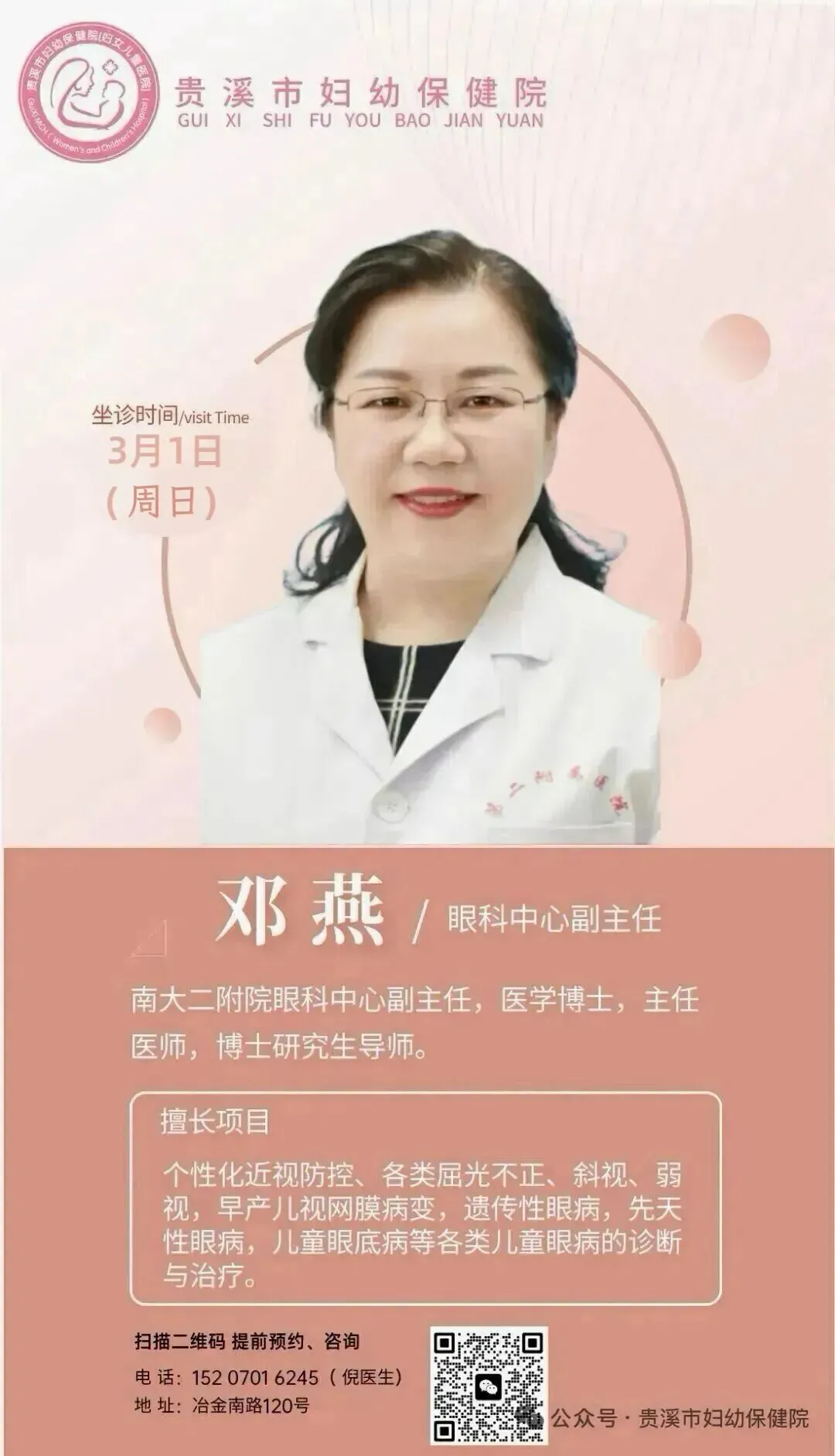 为了更好满足全市儿童及青少年的眼健康需求,让大家在家门口即可享受专业、优质的省级专家医疗服务,我院特邀请南昌大学第二附属眼科中心副主任邓燕博士于3月1日前来我院坐诊。