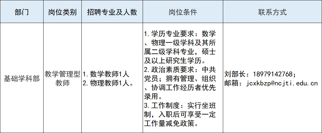 邮件格式:教学管理型教师+基础学科部+毕业院校+姓名学历+所学专业(例如:教学管理型教师+基础学科部+某某大学+张某某硕士+数学专业)。请在简历中列出您的工作经历及科研业绩。