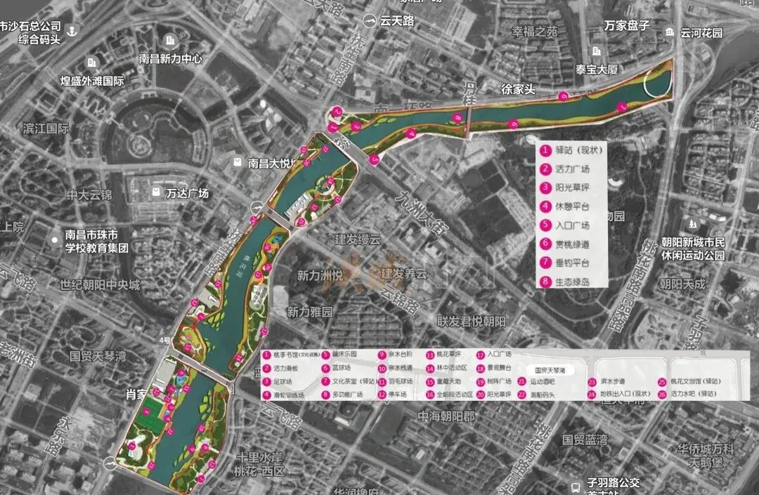从项目现场了解到,南桃花河水环境提升及生态修复项目(二期工程)已经完工。从实景图看,云锦路北侧区段河两岸土地肌理完成重整,同时增加了游步道和景观树等。从细节设计看,靠近翠菊路一侧设计有内凹式亲水平台,同时还打造了景观广场。靠近大悦城一侧,也同样打造有亲水平台和景观廊架,同时在地铁口区域还设置有机动车停车场。云锦路南侧靠近洲悦一侧,打造了大面积草坪广场,该节点还设计有自然过渡的坡道,同时还设置了景观用房。云飞路北侧靠近站前路学校节点处打造了集中式下沉广场,靠近马路一侧打造有路面停车场,该区域目前还在收尾施工。云飞路北侧靠近抚生路段设置有集中广场,同时还打造了廊架。云飞路南侧区域东段已经基本完工,西侧区域沿河滩涂施工完毕,景观广场和沉淀池等景观节点也在收尾施工。从现场进度看,目前项目已经基本完工,部分区域也已经开放,这也意味着南昌又将迎来一个大型水系公园。从区位看,该项目位于西湖区朝阳新城南桃花河,北起桃花南路,南至云海路;西临抚生路,东以翠菊路为界。