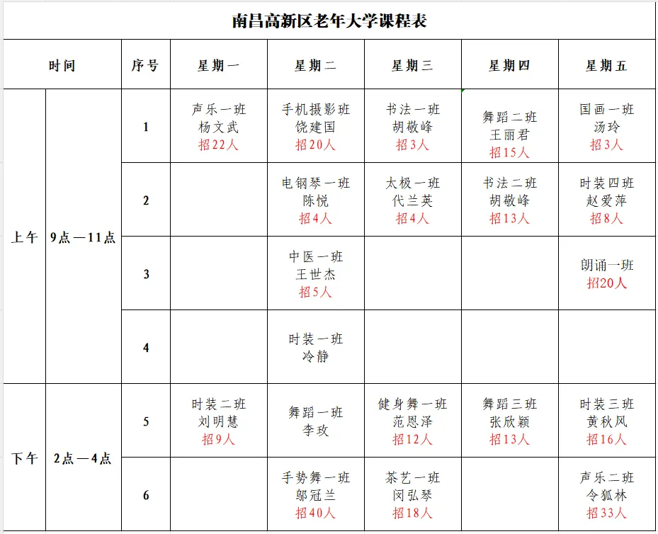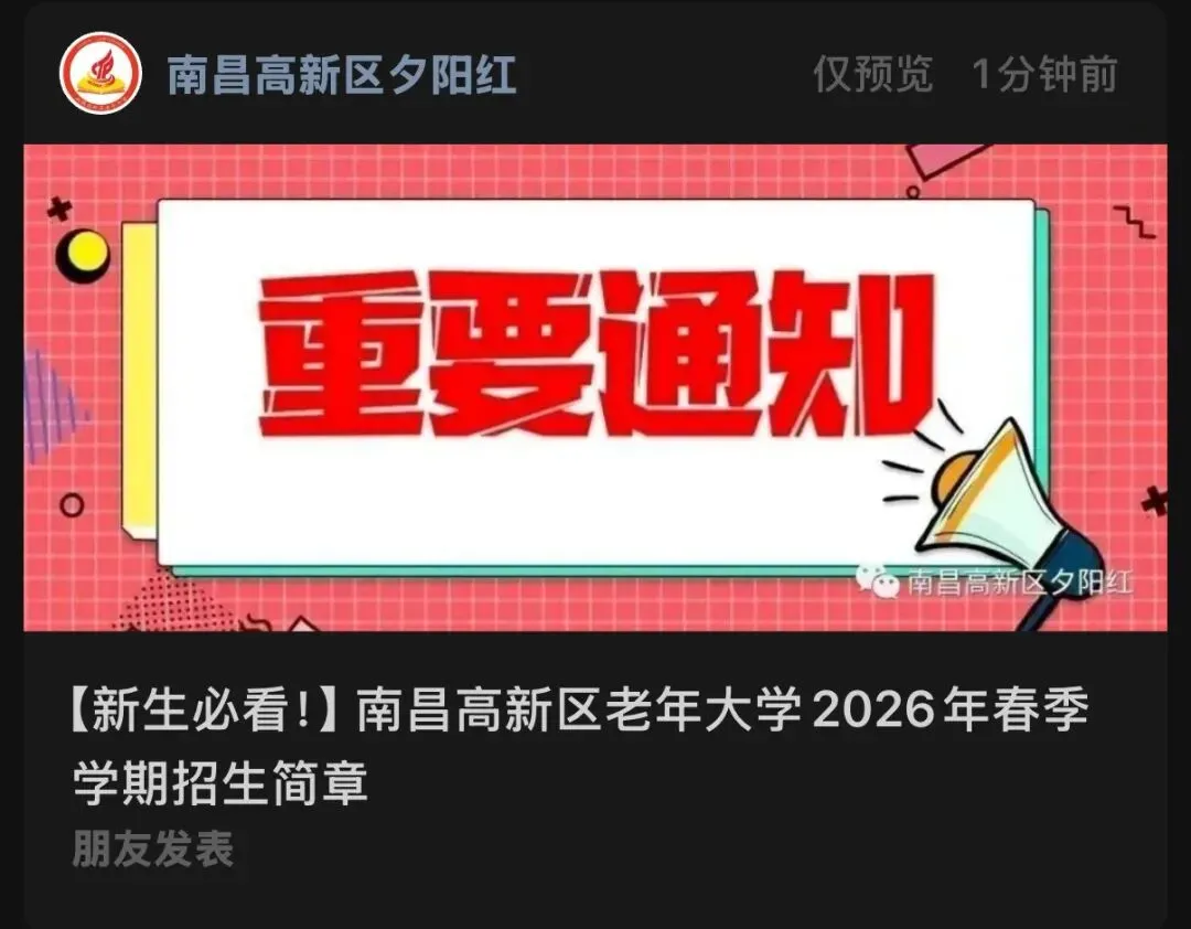 南昌高新区老年大学拟定于2026年3月9日正式开学,春季招收插班生,新生报名有关事项通知如下:居住在南昌市范围内,男55周岁以上、女50周岁以上,原则上不超过70周岁,身体健康,愿意并能坚持参加学习的老年人均可报名。三、报名方式及时间: