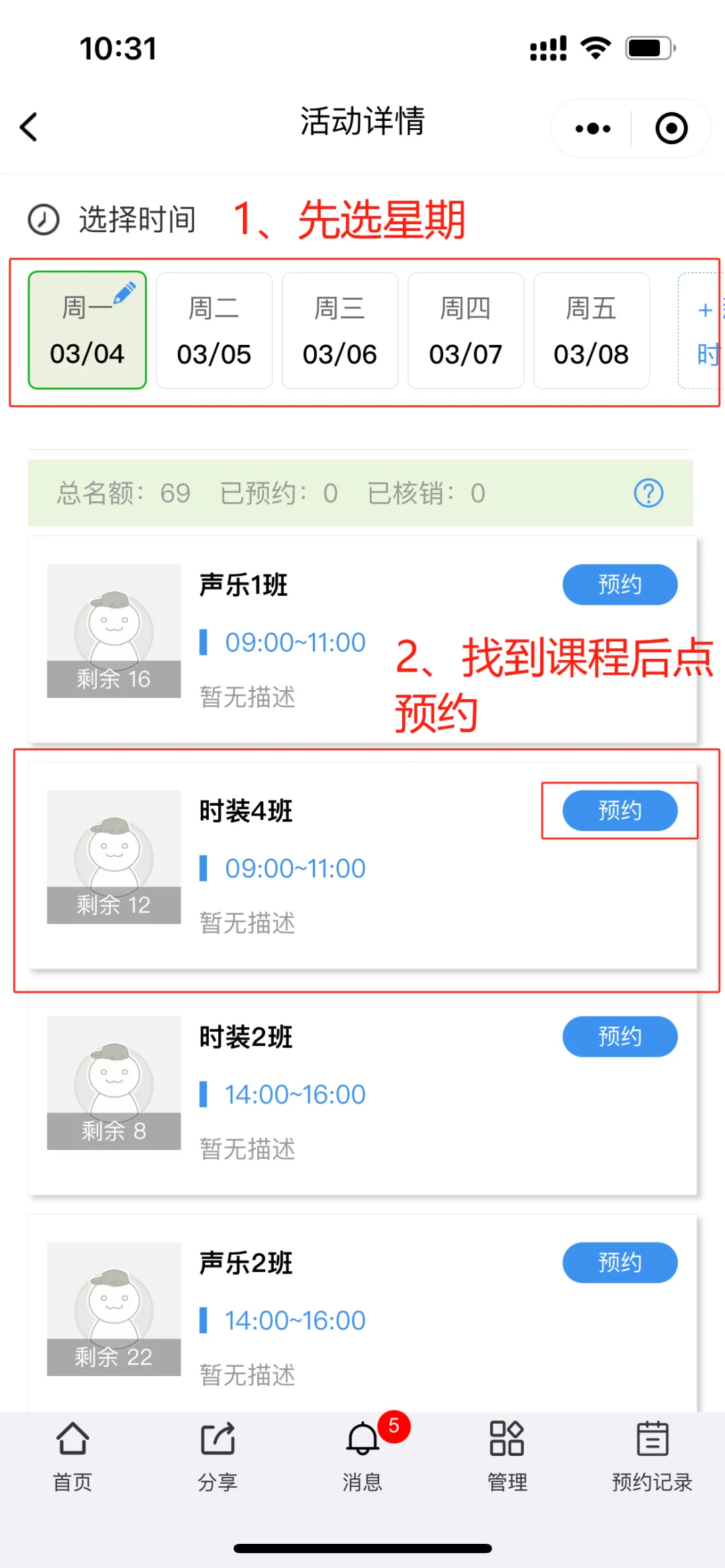 第一步:根据课程表上时间,找到您要报名的课程,先点击星期,再点预约。
