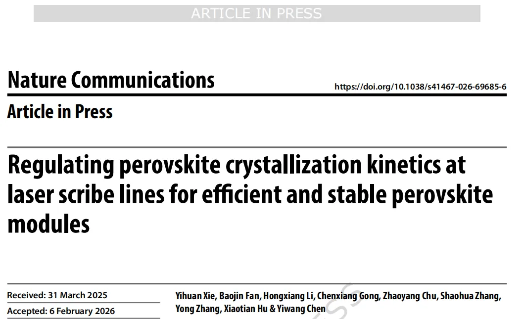 题目:Regulating perovskite crystallization kinetics at laser scribe lines for efficient and stable perovskite modules作者:Yihuan Xie, Baojin Fan, Hongxiang Li, Chenxiang Gong, Zhaoyang Chu, Shaohua Zhang, Yong Zhang, Xiaotian Hu & Yiwang Chen接受日期:First published: 20 February 2026原文链接:https://doi.org/10.1038/s41467-026-69685-6