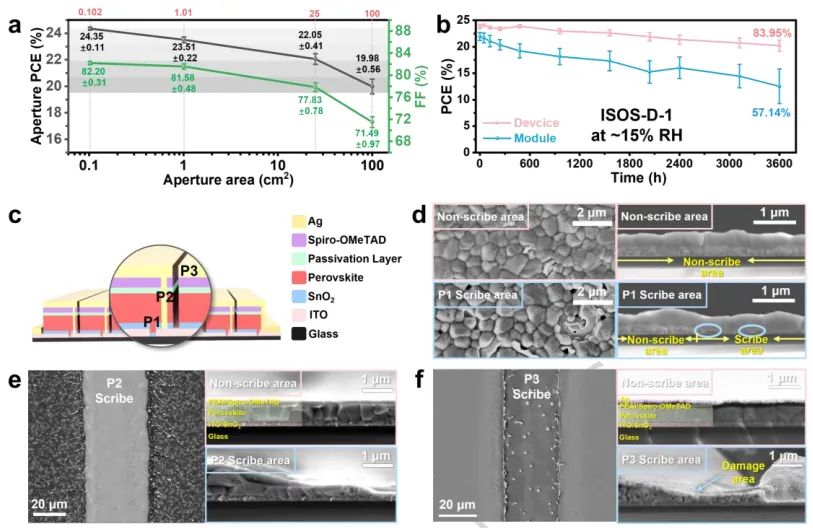钙钛矿太阳能电池(钙钛矿太阳能电池)的功率转换效率(PCE)已接近硅基同类产品,但其有限的长期稳定性仍是商业化应用的关键障碍。本研究发现,激光划线是影响钙钛矿太阳能组件(PSMs)稳定性的关键因素,这一点通过PSMs与钙钛矿太阳能电池之间观察到的不同退化速率得以证实。详细表征显示,P1划线区域因结晶动力学不匹配导致晶体质量较差且退化加速。此外,P2和P3划线工艺会引发局部热损伤,导致材料分解进一步削弱组件稳定性。因此,我们提出通过(E)-丁-2-烯-1,4-二胺二盐酸盐调控钙钛矿结晶动力学的策略,该方法可促进高质量、优先取向的钙钛矿薄膜形成,从而提升其环境耐受性。结果表明,孔径面积为25 cm² 和100 cm² 的PSMs分别实现了24.70%和23.89%的优异效率。值得注意的是,100 cm² 的 PSM 达到了23.55%的认证记录效率。此外,未封装的PSMs在环境空气(相对湿度约15%)中储存3,120小时后,仍保持初始PCE的93%,符合 ISOS -D-1标准。本研究为推进钙钛矿光伏技术长期稳定性的理解与改进提供了模块层面的视角。
