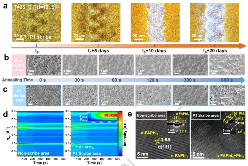 图2 | 对照钙钛矿薄膜在P1划痕线处的结晶过程。a、光学显微镜(OM)图像显示对照钙钛矿薄膜在室温下暴露于约15%相对湿度的环境空气中,随时间推移在P1划痕线处的退化情况。b、c、扫描电子显微镜(SEM)顶视图分别展示了对照钙钛矿薄膜在非划痕区域(b)和P1划痕区域(c)在150°C下热退火不同时间(0秒、30秒、60秒、120秒、300秒和600秒)后的形貌。钙钛矿界面处的白色片状晶体被圈出并标注为碘化铅。d、使用非划痕区域和P1划痕区域的沉积薄膜在150°C热退火过程中进行的原位 GIWAXS 测量。右上角插图显示了沿面外方向(qz)的 PbI₂ 衍射峰。e、对照钙钛矿薄膜在150°C退火10分钟后高分辨透射电子显微镜(HR-TEM)图像。插图为对应样品的 SAED 图谱。