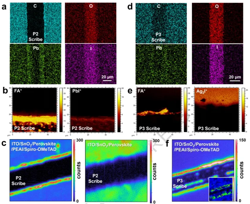 图3 | P2和P3激光刻蚀在对照钙钛矿模块中引起的热损伤。a、d、EDS映射(C、O、Pb、I)图像显示对照钙钛矿模块在P2划线(a)和P3划线(d)后的状态。图(a)和(d)中的测试区域分别对应P2划线区域(图1e)和P3划线区域(图1f)的SEM图像。b、e、二维 TOF -SIMS映射(正离子模式)显示对照钙钛矿模块:(b)P2划线区域检测到的离子FA⁺和PbI⁺;(e)P3划线区域检测到的离子FA⁺和 Ag₂I ⁺。c、f、二维PL映射照片显示对照薄膜在P2划线区域(c)和P3划线区域(f)周围的演变过程,其中(f)插图展示了P3区域的 TRPL 映射(TRPL 强度标度:0-140 ns)。使用氯苯从钙钛矿表面去除Spiro-OMeTAD(HTL)以暴露底层。通过胶带剥离顶部银电极来暴露Spiro-OMeTAD(HTL)表面。