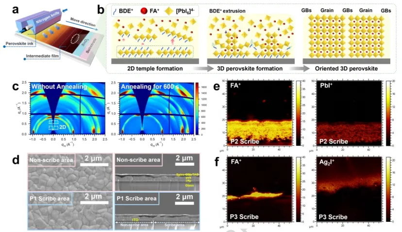 图4 | 调控钙钛矿结晶动力学以获得高质量钙钛矿薄膜。a,钙钛矿薄膜生长的刮刀涂布工艺示意图。b,自下而上二维模板化钙钛矿钙钛矿薄膜生长的结晶机制示意图。c,靶钙钛矿薄膜在不同退火时间(0秒和600秒)下的原位二维 GIWAXS 。d,钙钛矿前驱体溶液中添加“2 mol% BDECl”的非划痕区域和P1划痕区域的SEM图像及横截面SEM图像。e,f,靶钙钛矿模块的二维 TOF -SIMS映射(正离子模式):(e) P2划痕区域检测到的离子FA⁺和PbI⁺;(f) P3划痕区域检测到的离子FA⁺和 Ag₂I ⁺。