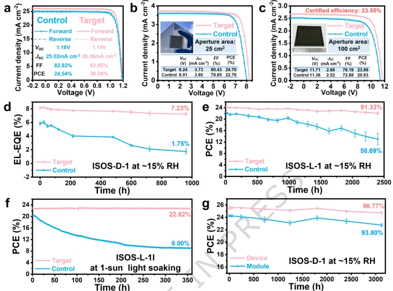 图5 | 小面积钙钛矿太阳能电池和大面积PSMs的光伏性能。a、基于控制和目标的冠军钙钛矿太阳能电池的J-V特性,孔径面积为0.102 cm²。b、c、基于控制和目标的冠军PSMs的J-V特性,孔径面积分别为25 cm²(b)和100 cm²(c)。d、控制和目标模块随时间变化的EL- EQE 演化曲线。器件定期测试从1 V到2.5 V,每步为0.1 V。e、基于控制和目标的未封装PSMs在1秒太阳光照下(使用白色发光二极管,100 mW cm⁻²)的PCE随时间变化,环境空气湿度约15%,室温,根据 ISOS -L-1。f、在25°C下使用N2气流,基于控制和目标的PSMs(25 cm²)在1秒太阳光照下(使用白色发光二极管,100 mW cm⁻²)的连续最大功率点跟踪。g、根据 ISOS -D-1,在环境空气湿度约15%,室温下,未封装钙钛矿太阳能电池(0.102 cm²)和PSMs(25 cm²)的长期稳定性。器件定期测试在AM 1.5G辐照下,使用Xe弧灯,100 mW cm⁻²。数据以均值±标准差表示,d、e和g中追踪了每种条件下十个器件随时间变化的PCE。