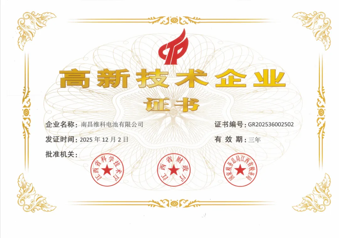 近日,南昌维科电池有限公司顺利通过国家高新技术企业认定,荣获国家高新技术企业证书,标志着公司在技术创新、研发实力、成果转化与高质量发展等方面获得国家级权威认可。