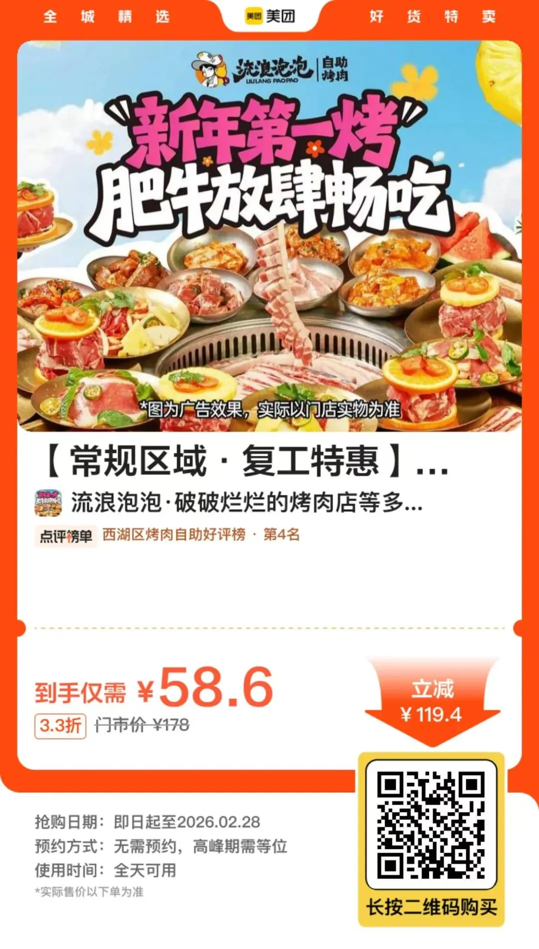 南昌吃货速囤!「流浪泡泡」单人无限自助烤肉58.6!热门榜TOP1,7天热销700+