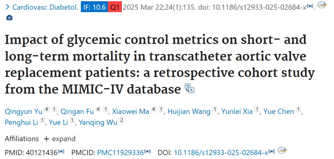 今天睿因生物给大家推荐的文章由南昌大学第二附属医院心血管内科团队使用MIMIC-IV数据库,发表在期刊《Cardiovasc Diabetol》(IF=10.6)的题为:“Impact of glycemic control metrics on short- and long-term mortality in transcatheter aortic valve replacement patients: a retrospective cohort study from the MIMIC-IV database”的研究论文。