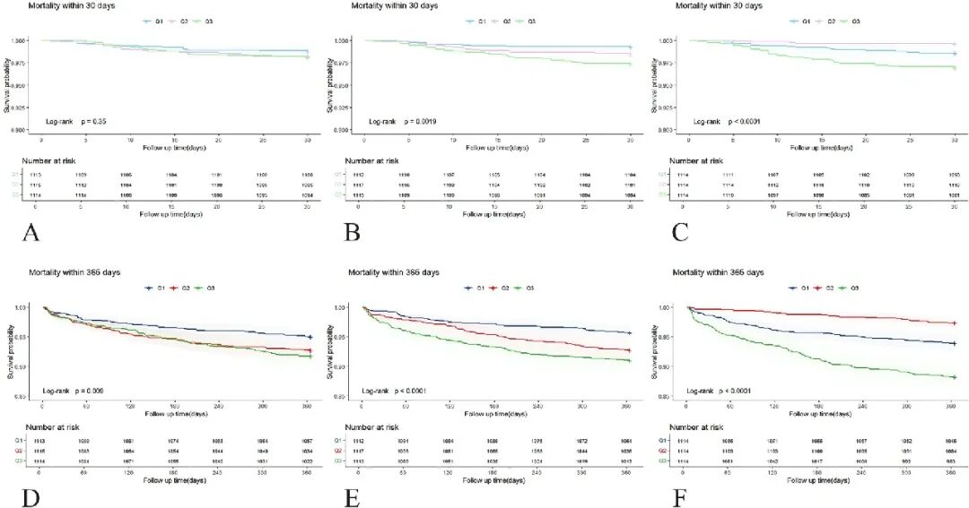 结果显示:HGI低水平(Q2组)是365天死亡率的风险因素;SHR高水平(Q3组)在各调整模型中均显著关联30天和365天高死亡风险;GV低(Q2组)、高(Q3组)水平仅与365天死亡率显著相关,且GV对长期死亡预测能力最强(AUC=0.629)。外部数据中三者与死亡率趋势一致,但无统计差异。
