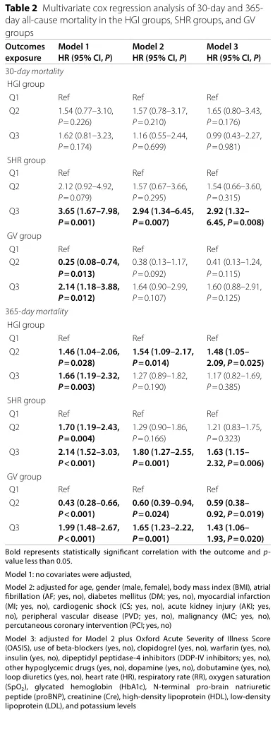 不同HGI、SHR、GV水平亚组的患者关键结局有显著差异,且HGI和SHR的Q1亚组死亡率最低,故以Q1为参考构建Cox回归模型分析。