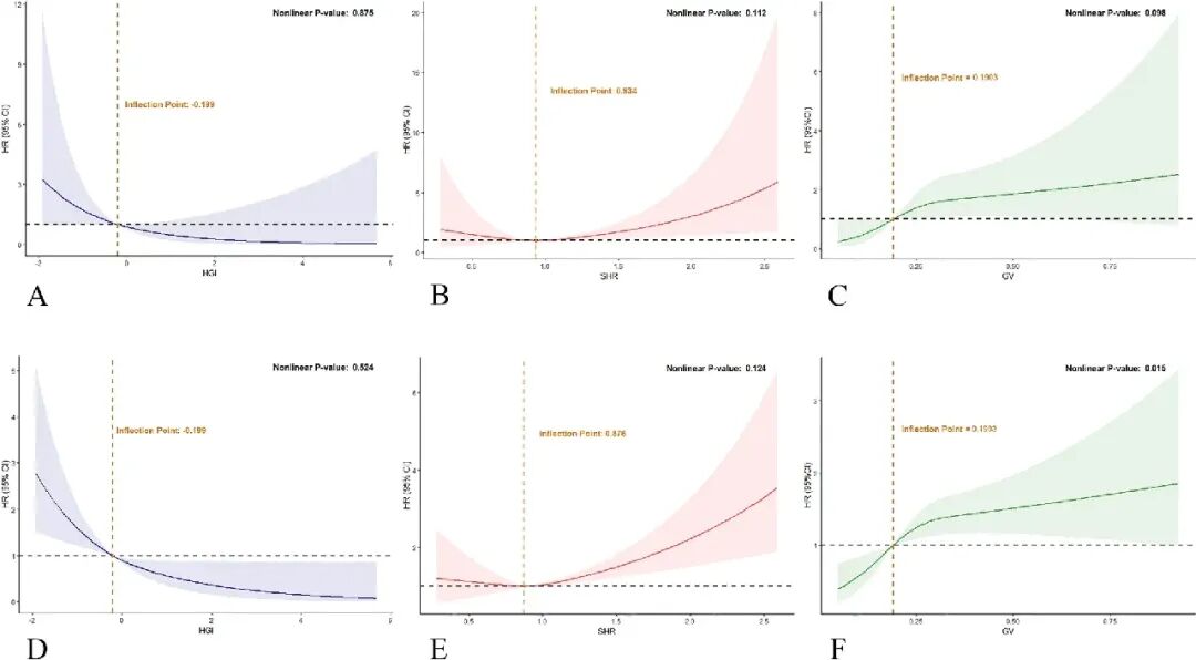 经限制立方样条分析(调整多种混杂因素):HGI、SHR与TAVR患者短/长期死亡风险呈线性倒“L”形关系(非线性P>0.05);GV与关键结局呈非线性“S”形关联(非线性P=0.015),与其他结局为线性“S”形关系。