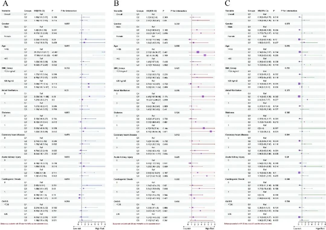 按性别、年龄等多因素进行亚组及交互分析,结果显示:低HGI在女性、≥65岁等人群中与长期死亡风险显著相关,超重/肥胖者高HGI风险更强;高SHR在男性、<65岁等人群中与30天及365天死亡风险显著相关;高GV在男性、肥胖等人群中与365天死亡风险显著相关,且仅CHD亚组中GV与365天死亡率存在显著交互作用(P=0.006)。其余协变量组无显著交互影响,GV与30天死亡率无亚组关联。