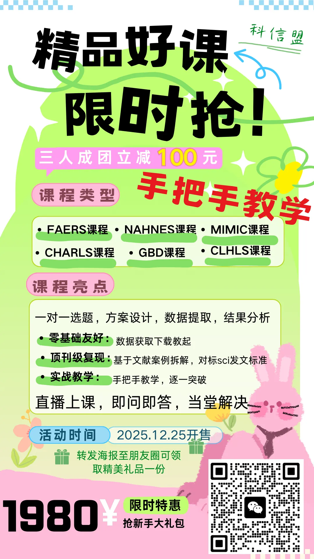 你的「公共数据库通关秘籍」已送达!从FAERS、NHANES到MIMIC、CHARLS,六大核心数据库一网打尽。我们不要你“感觉会了”,我们要你真的能做出来、发出去!