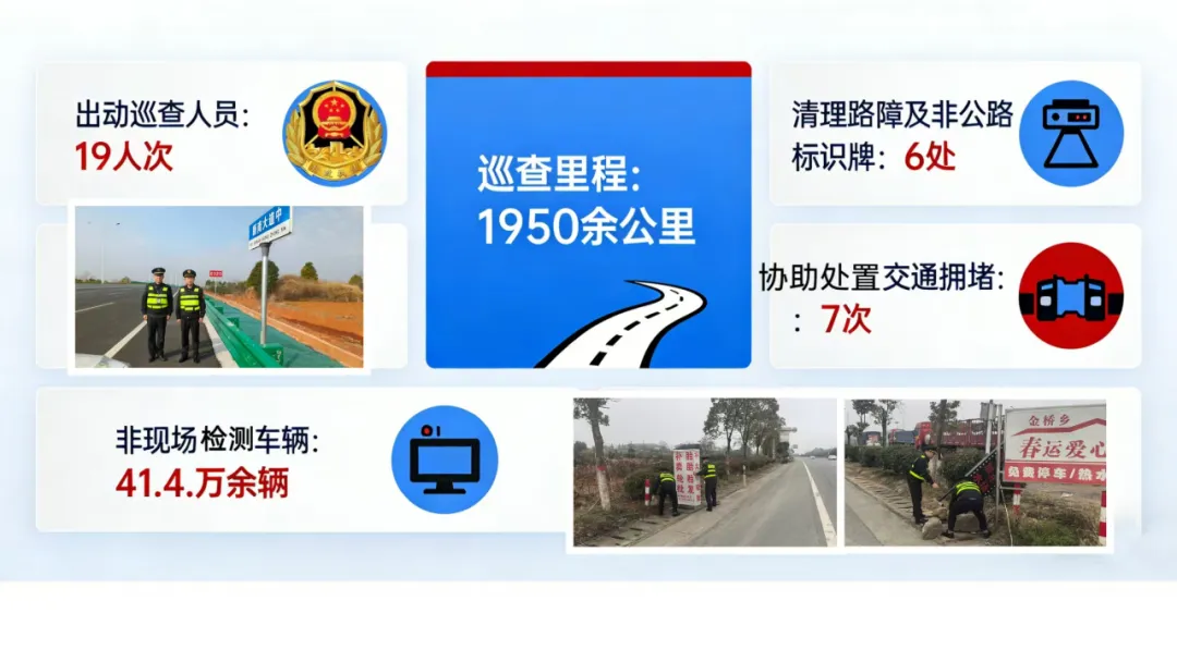 加密国省道重点路段巡查频次,对桥梁、临水临崖、急弯陡坡及事故多发路段开展全方位排查,及时清理路面障碍物、非公路标识牌及占道经营,协助疏导交通拥堵。春节期间,累计出动巡查人员19人次、巡查车辆9辆次,巡查里程1950余公里,清理各类路障及非公路标识牌6处,协助处置交通拥堵7次;全市涉路施工项目全部停工并规范设置警示标志,公路通行环境安全有序、畅通高效。