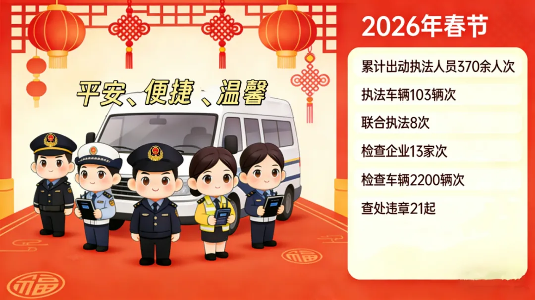 春节期间,累计出动执法人员370余人次、执法车辆103辆次,联合市公安交管支队开展执法8次,检查道路运输企业13家次,运输车辆2200余辆次,查处违章21起(其中非法营运3起、网约车无证经营10起、出租车违规经营6起、其他违规经营2起),以“零容忍”态度净化道路运输市场。