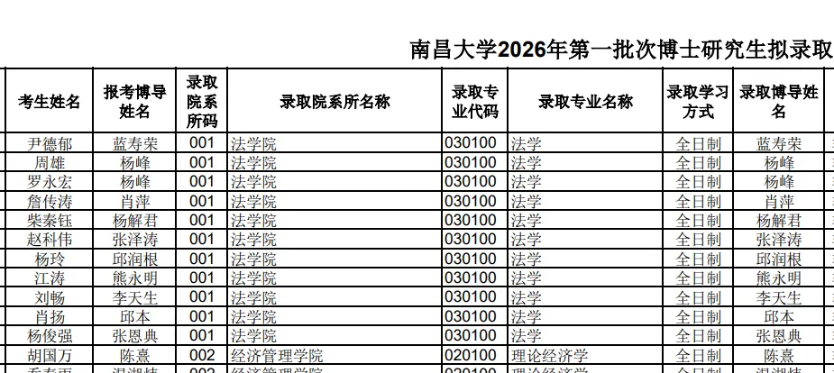 南昌大学法学院2026年第一批次博士研究生拟录取名单公示,238人