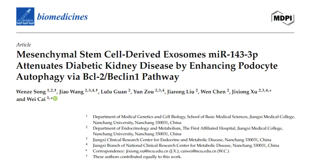 近日,南昌大学江西医学院的研究团队在国际期刊《Biomedicines》发表了一项重磅研究成果,首次揭示了骨髓间充质干细胞来源的外泌体中 miR-143-3p 通过调控细胞自噬通路改善糖尿病肾病的全新机制,为这一难治性疾病带来了无细胞治疗的新方向,相关研究论文于 2026 年 1 月 14 日正式刊发。
