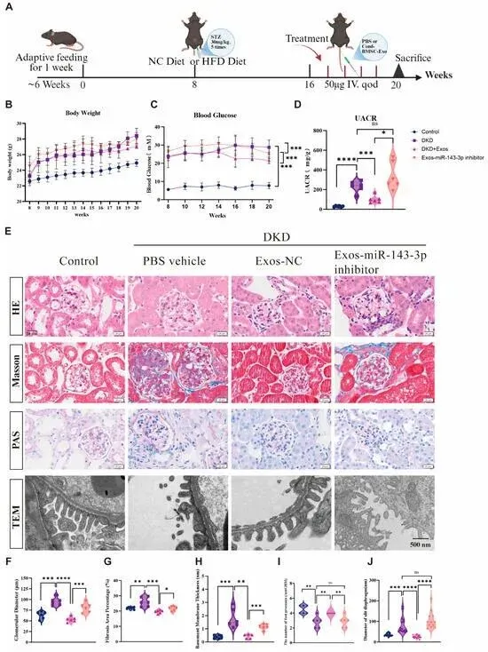 图2.携带miR-143-3p的BMSC衍生外大细胞能减缓DKD进展,并在体内改善肾脏结构损伤。