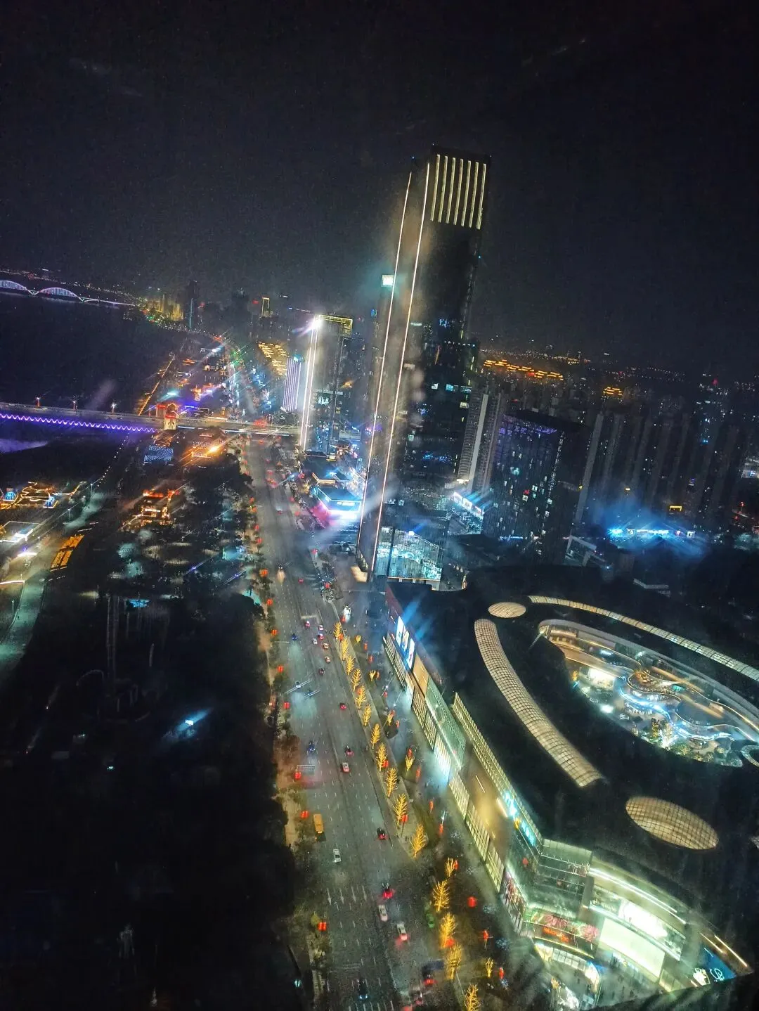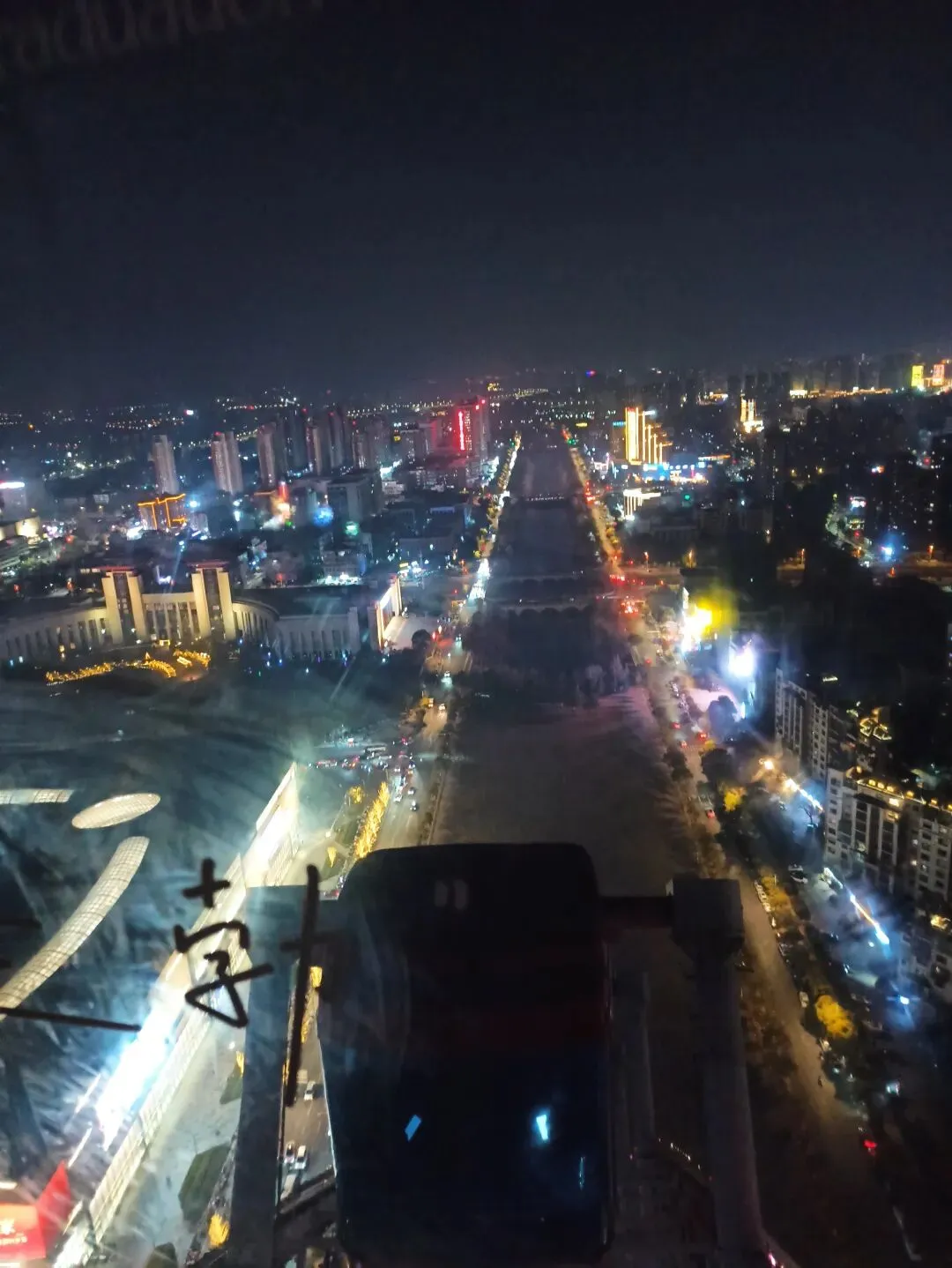 舱机缓缓上升,城市璀璨的夜景在脚下徐徐铺展开来,犹如置身绚丽的画卷中。