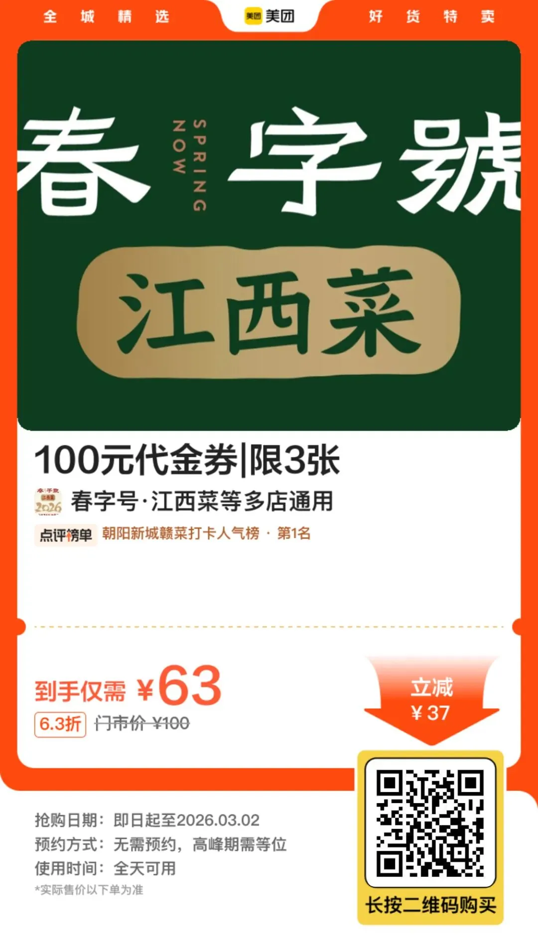 南昌「春字号」优惠券:63抵100可叠加
