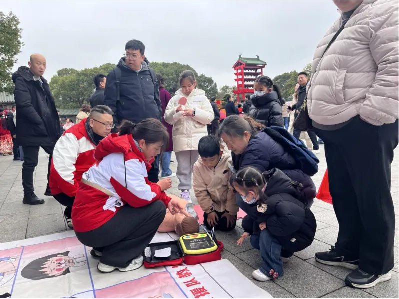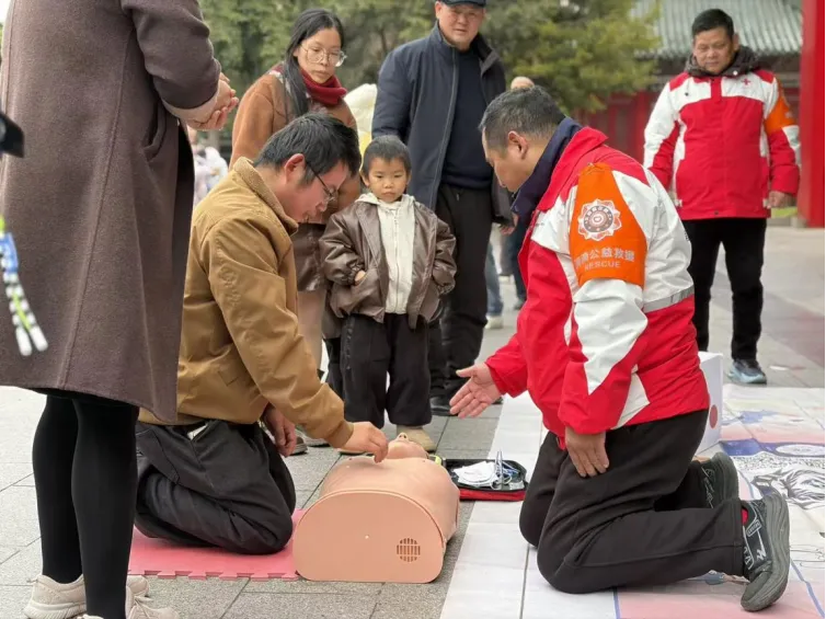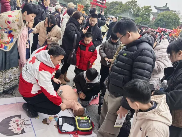 在做好应急保障的同时,救援队创新开展急救知识普及活动,将红十字救护站的功能从“被动响应”延伸至“主动传播”。队员们推出“户外急救地摊”,将急救课堂从室内移至景区街头,以“摆摊教学、现场互动”的方式,向广大游客普及心肺复苏(CPR)、自动体外除颤器(AED)使用、气道异物梗阻救治、心梗脑梗预防及溺水预防等日常急救知识。