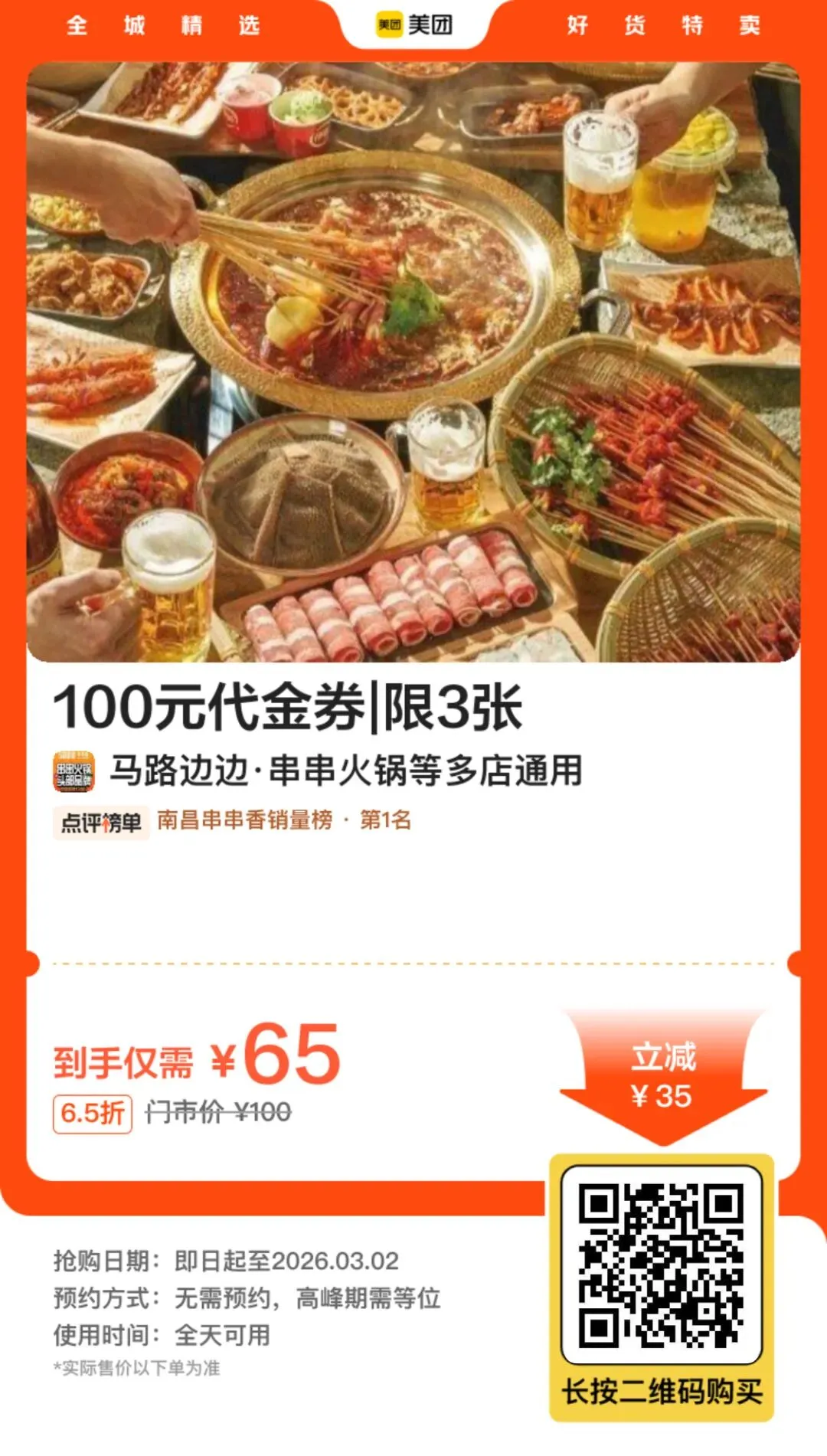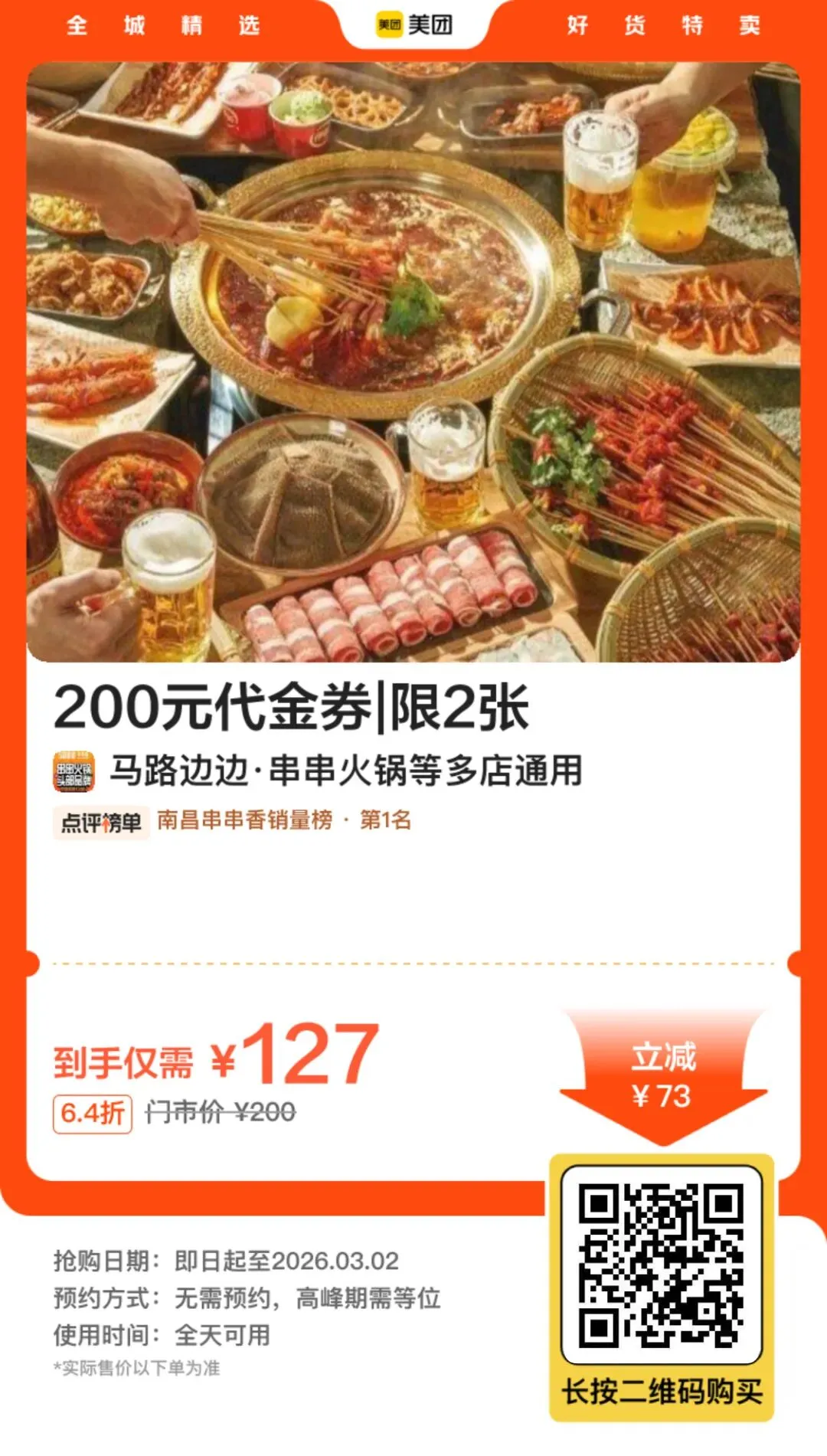 >南昌串串火锅「马路边边」优惠券:65抵100,127抵200可叠加