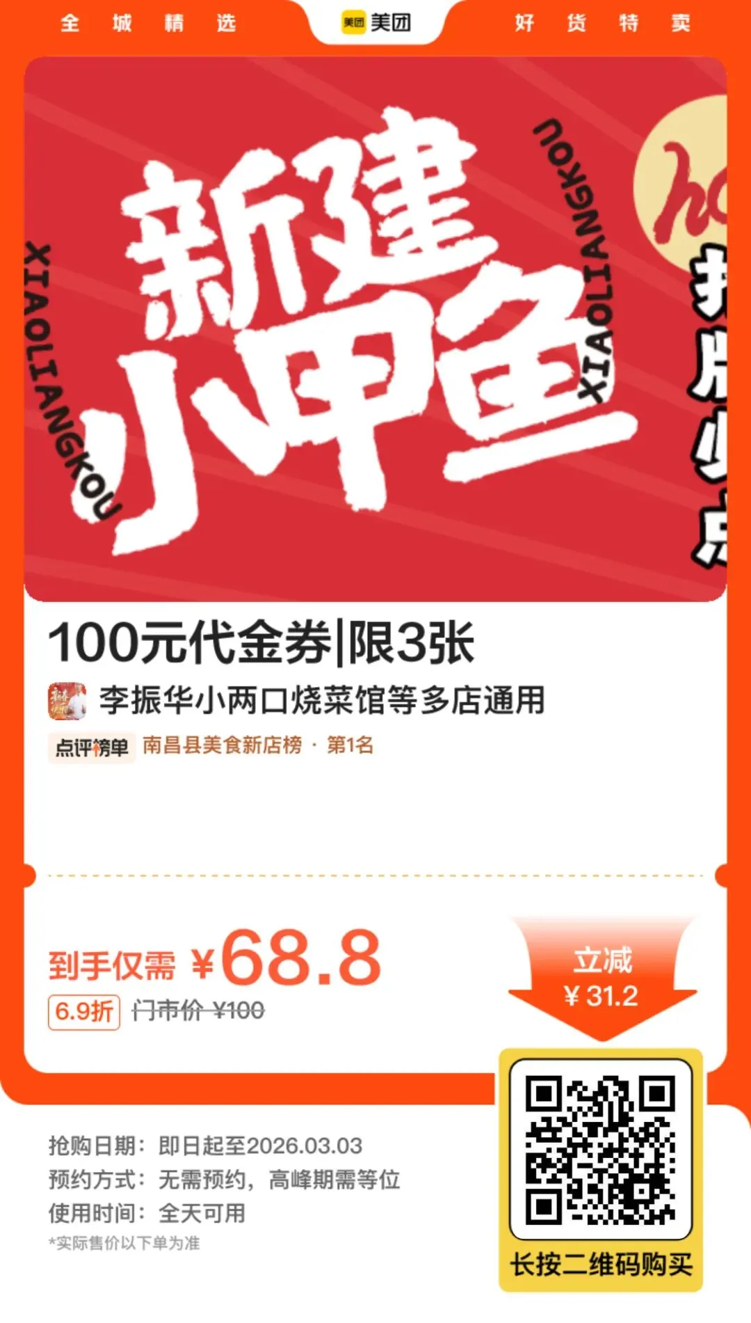 >南昌「李振华小两口烧菜馆」优惠券:68.8抵100可叠加