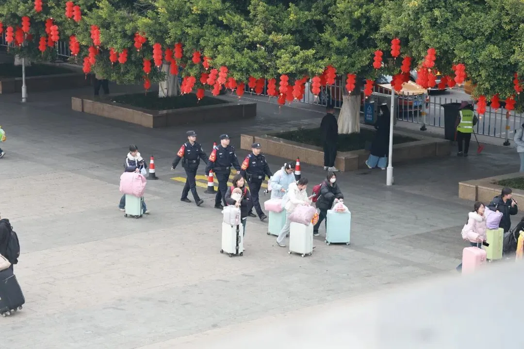 故事:一串串红灯笼挂满枝头,烘托出浓浓年味,藏蓝身影穿梭在站前广场,默默守护着每一个奔赴团圆的归乡人。