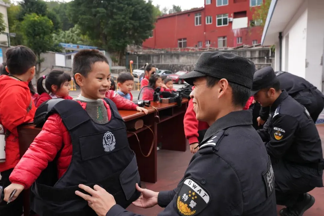 故事:警营开放日,小朋友争先恐后试穿警察防刺背心,体验“当警察”。
