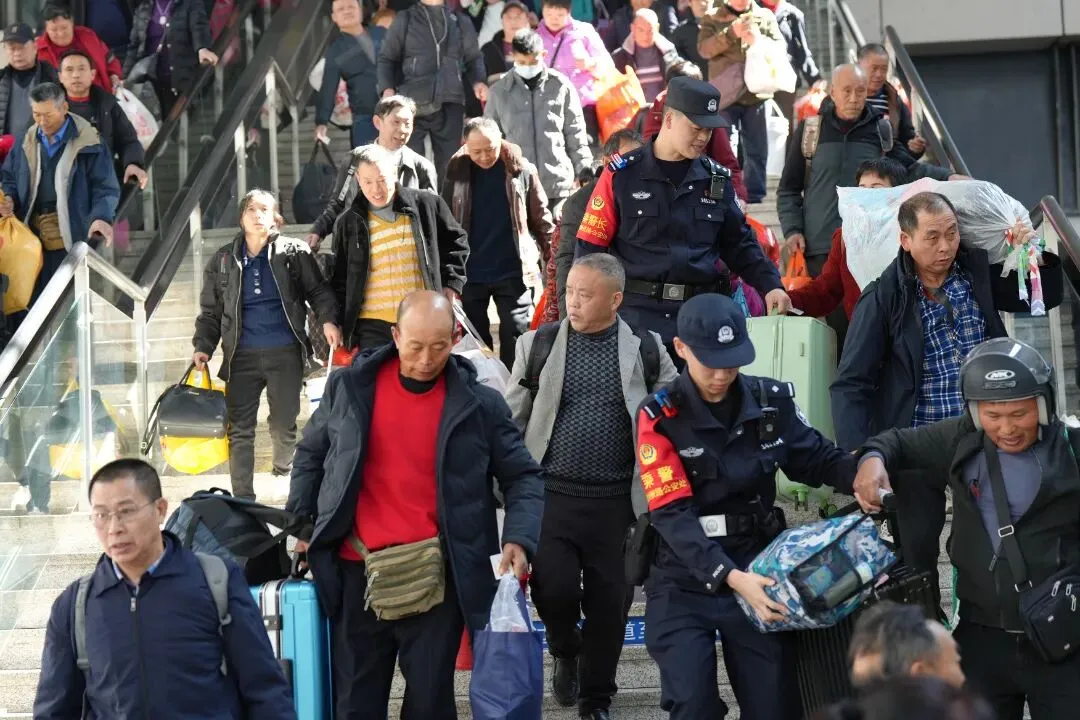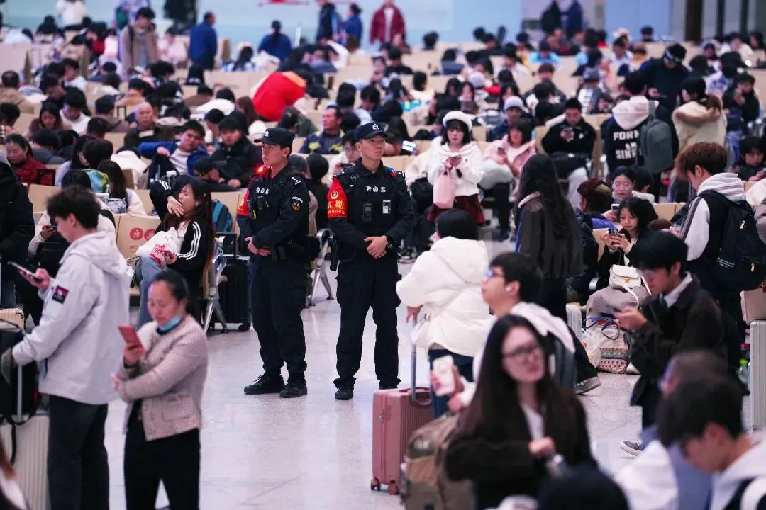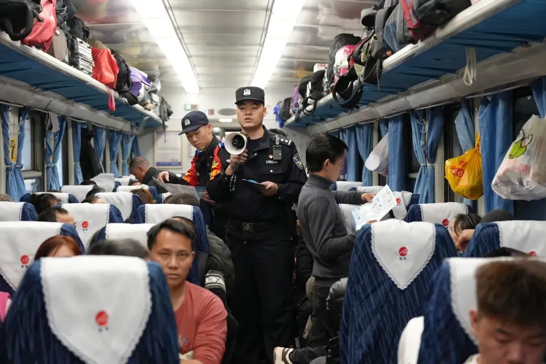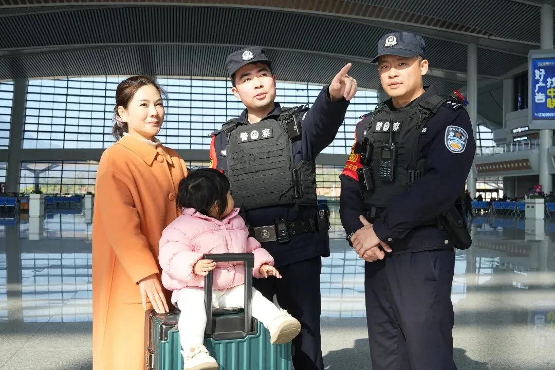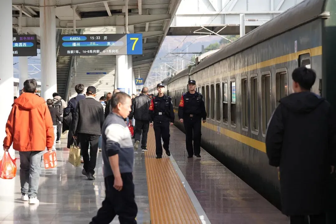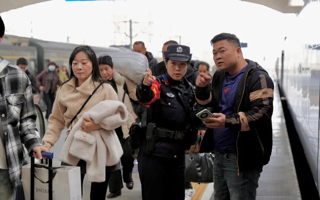 故事:春运中,列车乘警在熙熙攘攘的客流中引导旅客出站,组织好列车乘降秩序,护航旅客平安出行。