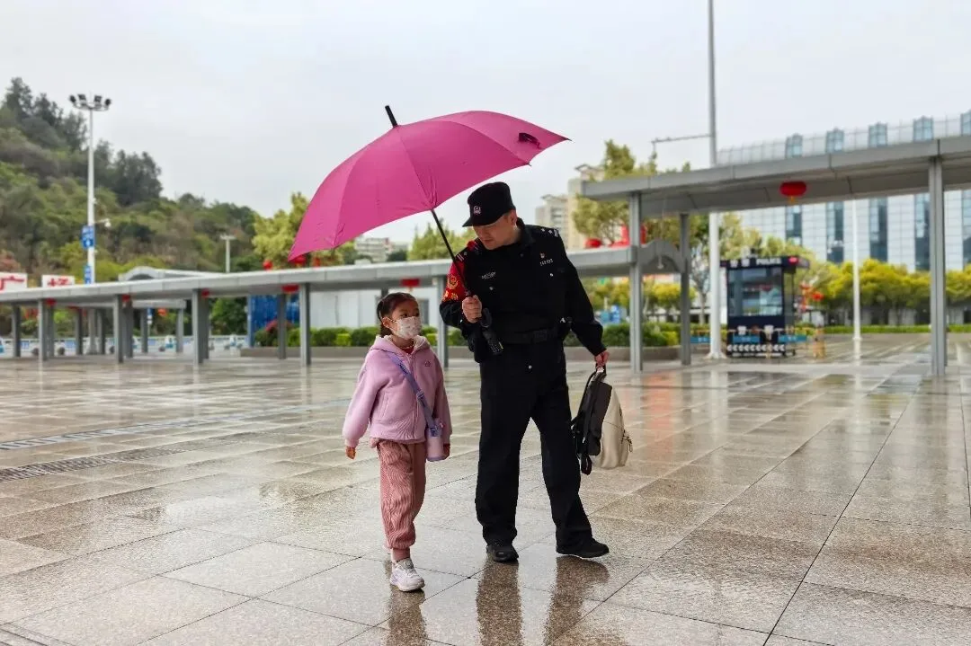 故事:春运期间,大雨突降,厦门站派出所民警在巡逻时发现一名与家人走散的小女孩,便将雨伞稳稳倾向孩子,护送她前往服务台寻亲,让漫漫归途充满融融暖意。