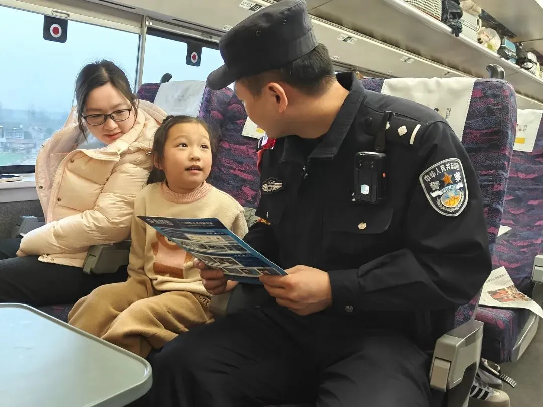 故事:飞驰的高铁车厢内,南昌铁路公安处乘警支队民警正为小旅客生动讲解安全知识,用耐心专注温暖归乡旅程,将安全的种子播撒进孩子心田。