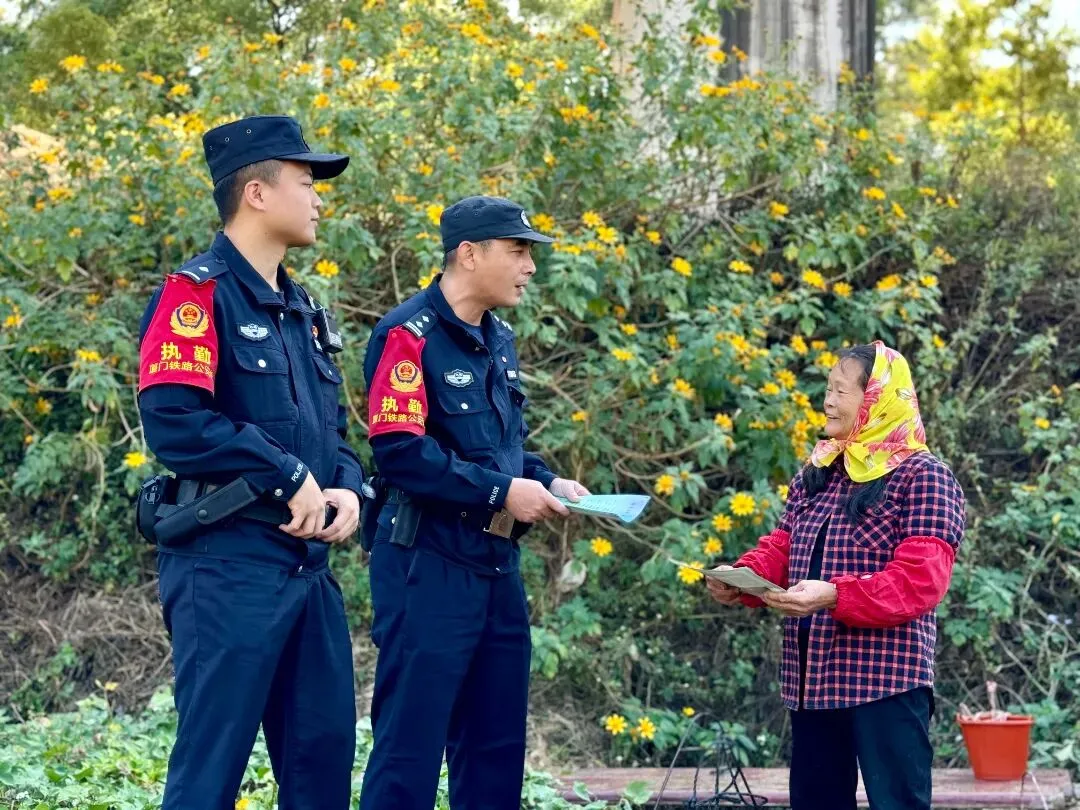 故事:泉州站派出所民警走进沿线乡村,在开满黄色野花的田埂旁,向村民开展安全宣传。民警耐心讲解铁路沿线的安全注意事项,老人家认真倾听,这是铁路公安深入基层、守护群众安全的日常缩影。