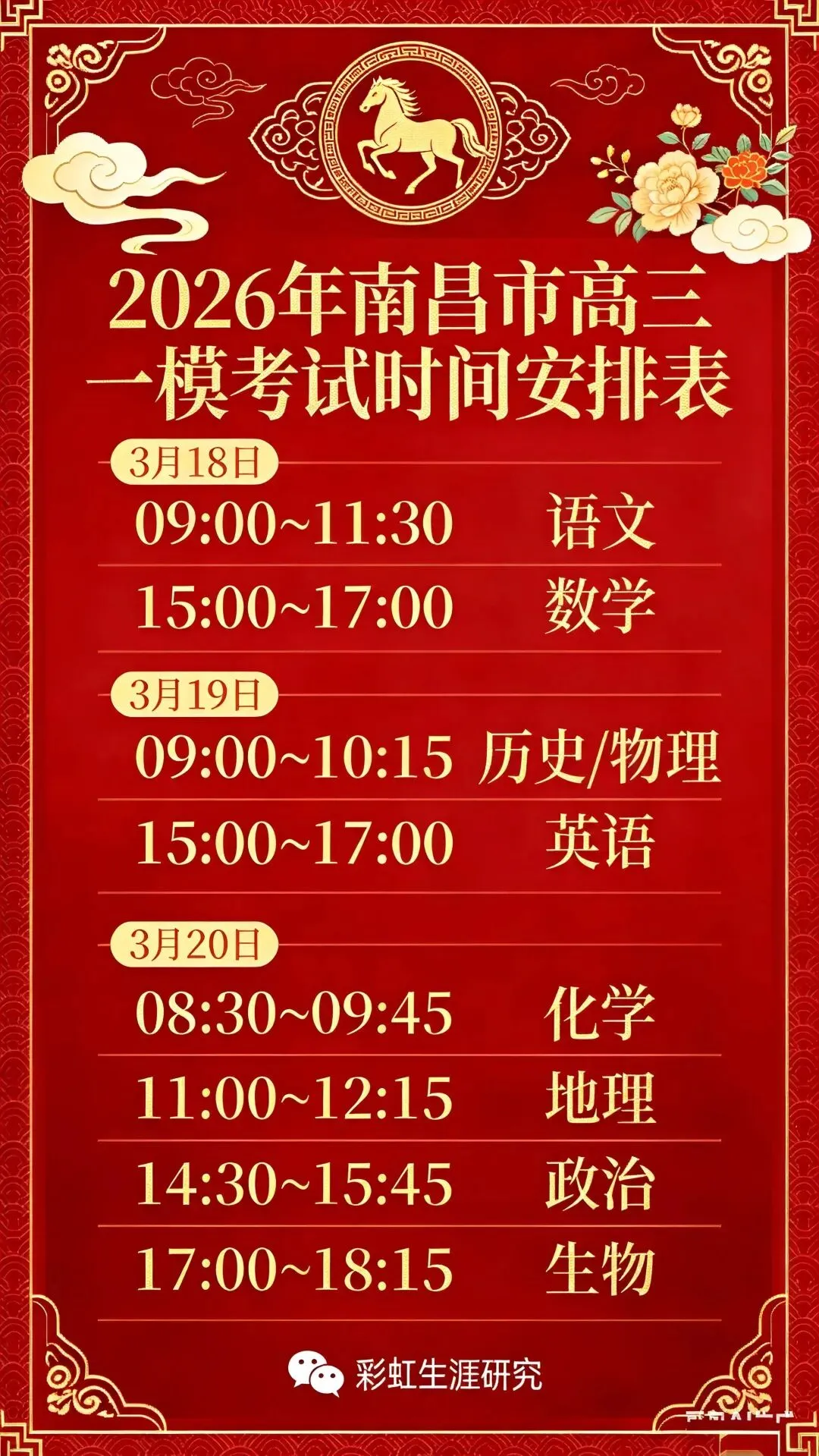 据悉,南昌市2026届高三一模考试将于3月18日~20日开考,各科目具体时间安排如下: