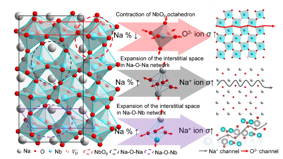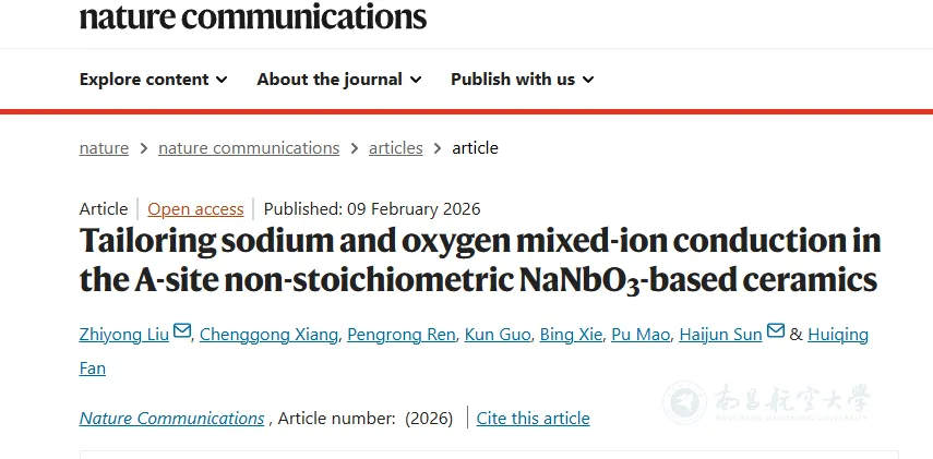 近日,南昌航空大学动力与能源学院(绿色通用航空动力江西省重点实验室)教师刘智勇、孙海俊牵头,联合西安理工大学、西北工业大学研究人员在钙钛矿离子导体领域取得突破。团队创新性通过精准调控NaNbO3基陶瓷的 A 位非化学计量比,诱导形成 “缺陷类型-氧八面体畸变-离子通道”的动态适配体系,成功构建兼具可调离子和定向离子高传导性的新型陶瓷,其核心机理突破为固态电池离子传导材料研发提供了全新范式。该研究成果“Tailoring sodium and oxygen mixed-ion conduction in the A-site non-stoichiometric NaNbO3-based ceramics”发表于《自然·通讯》(Nature Communications),动力与能源学院与绿色通用航空动力江西省重点实验室为论文第一单位及唯一通讯单位。