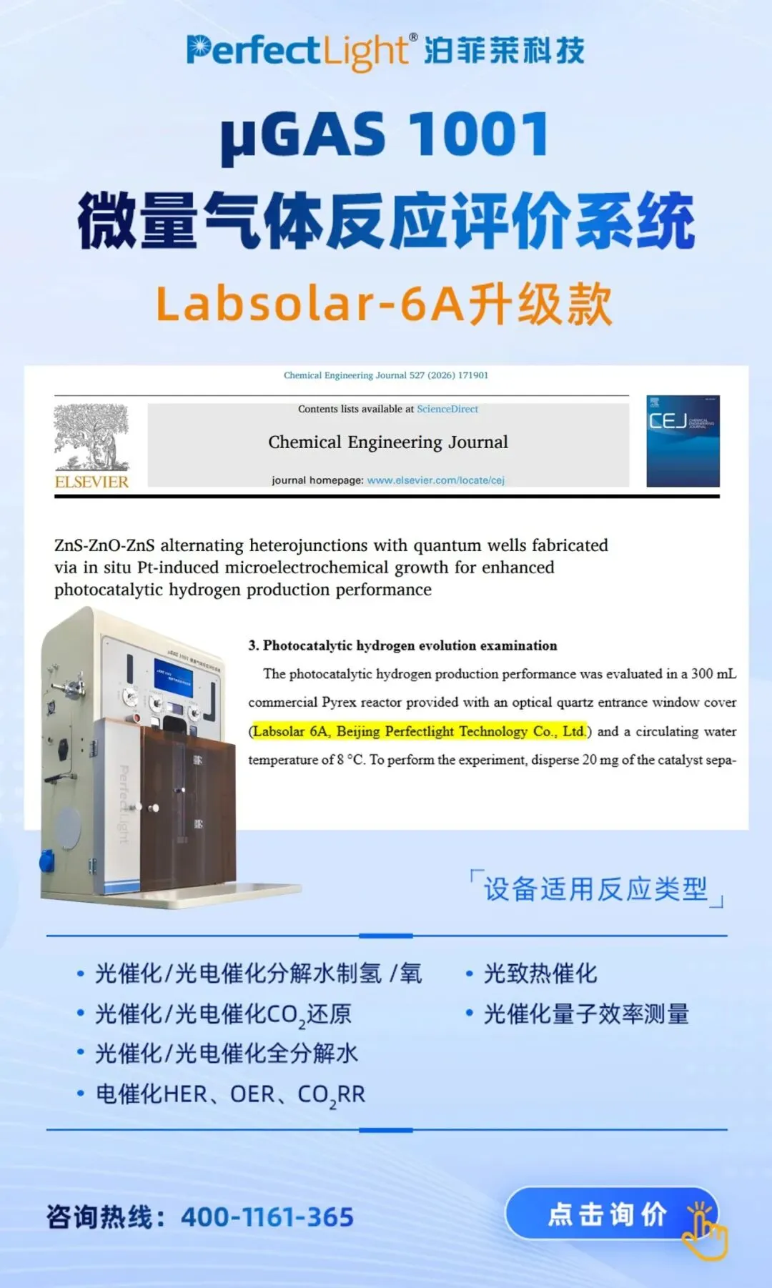 关键词:Perfectlight; 泊菲莱; Labsolar-6A ; 光催化分解水系统; 光催化二氧化碳还原系统; 反应器联用; 光催化; Chemical Engineering Journal 2025